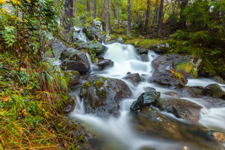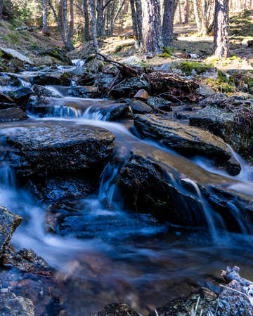 Wild mountain river. Mountain scenery. Autumn colors in the mountains of Madrid. Whitewater waterfalls in the high mountains.