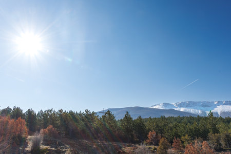 beautiful landscape with trees and snowy mountains under the clear sky with sun and its lights