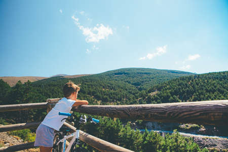 Young boy with bike admiring the landscape at the top of a mountain on a sunny day. Copy space area available