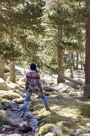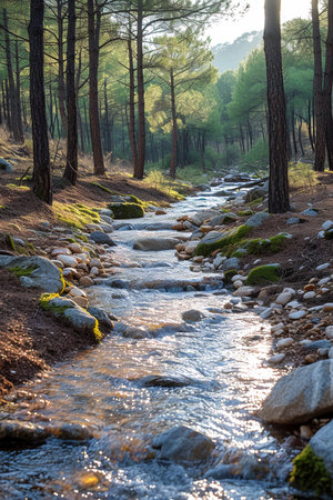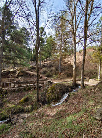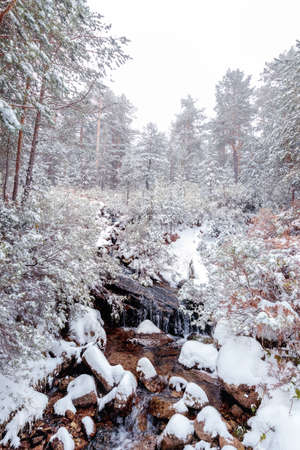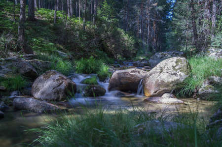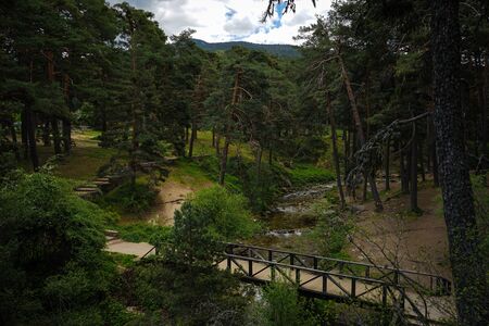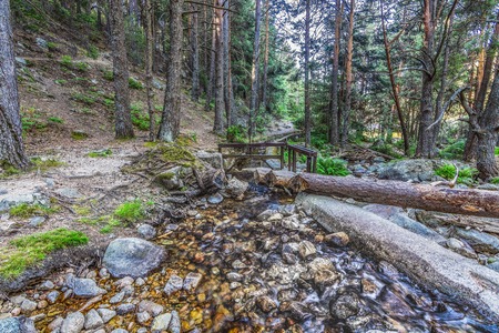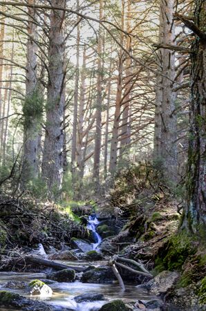 Pine forest in Guadarrama sierra with an old watergate over a stream. madrid Spain