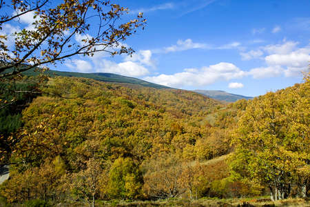 Mountain landscape with forests of green, red, orange and yellow colors that contrast the landscape. Beautiful views of nature with blue and gray skies.