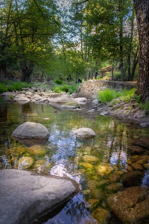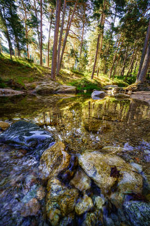 Stream with transparent water and reflections of the forest trees. Navacerrada.
