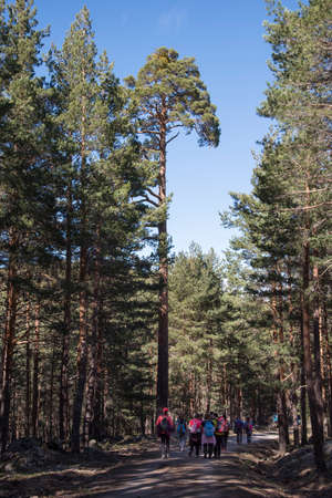 Path among pines for hikers in the Sierra de Guadarrama national park. Lights and shadows. Segovia, Madrid, Spain