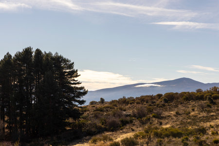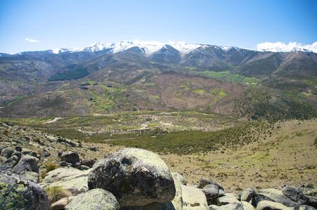 horizontal landscape of the sierra de guadarrama on the segovia slope, is a spring photograph when the snow melts with the sun begins and the winter snow disappears and gives way to the green colors