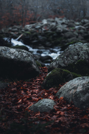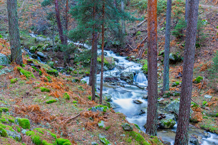 River with small waterfalls in autumn, with dry trees and moss, Lozoya Valley, Madrid, Spain