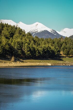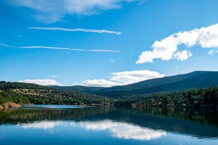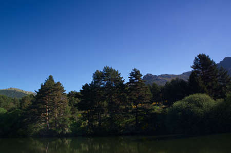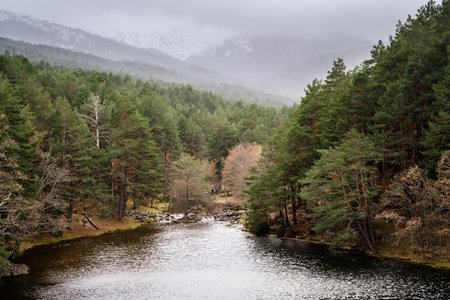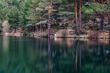 Pine forest reflecting on the lake water in a mountainous area on a misty day. Navacerrada, Madrid