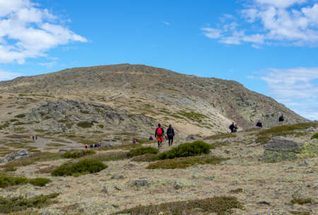 Hikers and hikers climbing the mountain on a trail on a sunny day. Ascent to Peñalara in the Sierra de Madrid.