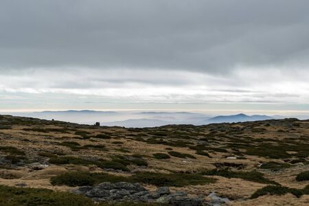 Trekking path on Guadarrama mountain range in a day with clouds and blue sky, Sierra de Guadarrama, Madrid, Spain