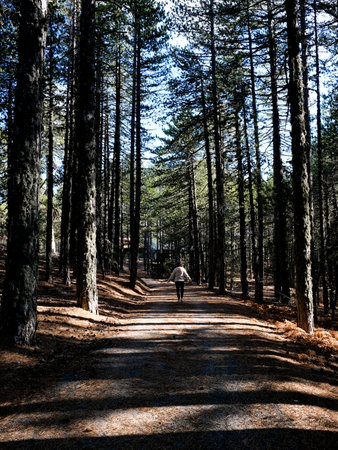 Teenage woman walking in the forest with tall pine trees. Healthy lifestyle in nature