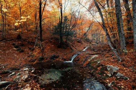 Autumn landscape with golden tree leaves in a magical forest. Selective focus.