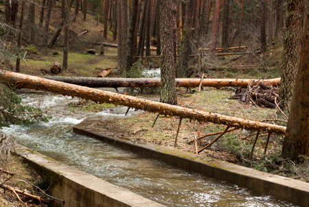 Fallen pines over the river in the mountains of Segovia, Spain. Gale, tornado, strong winds.