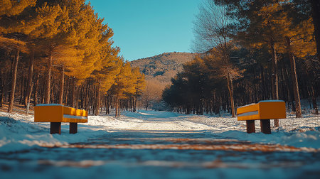 Wooden bench in the winter forest. Beautiful winter landscape in the mountains.