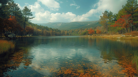 Autumn landscape with lake and forest in mountains. Colorful trees on the shore.
