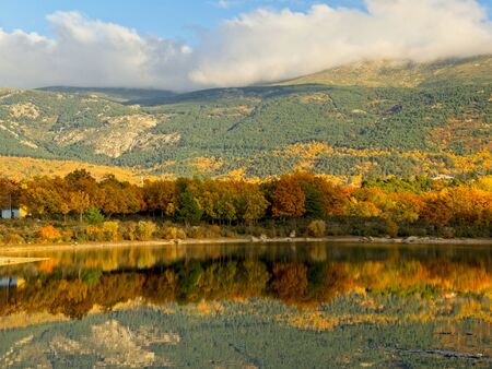 Landscape reflections and clouds in a lake with the soft light of sunset in autumn