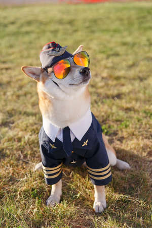 Funny photo of the Shiba Inu dog in a pilot suit at the airport