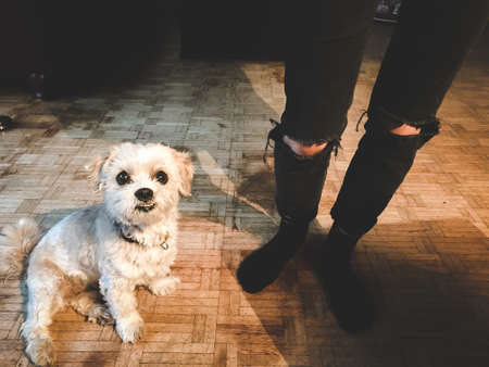 little dog lying on hardwood floor at home