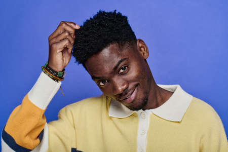 Portrait of African young man in bright shirt with bracelets on his arm posing at camera against blue background
