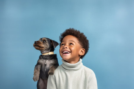 Generative AI : Funny cute little African American boy in suit and bunny ears smiling and looking at camera while imitating rabbit against blue background