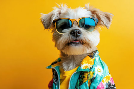 Cool and cute dog in a vibrant summer jacket and sunglasses, standing confidently and isolated on a solid background, pet fashion style.
