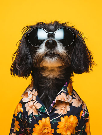 Cute black and tan doggy with sunglasses and floral shirt on yellow background