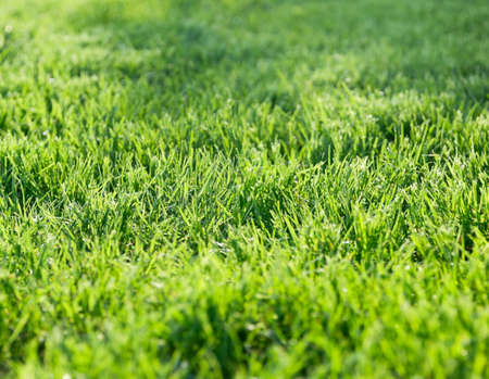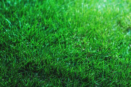 Close-up detailed background of fresh green bright grass on sunny summer day. Beautifully mowed lawn. Nice rest area.