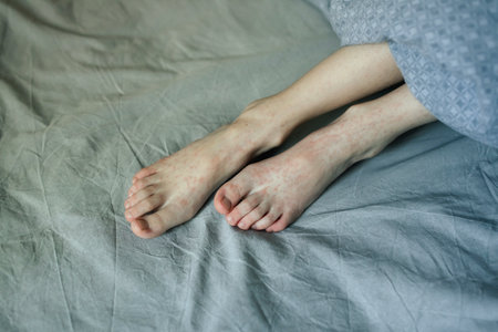Close up of Child's legs with many red spot. A sick child with skin rashes in bed. Allergic reaction, Drug allergy, Scarlet fever, Atopic dermatitis, Diaper rash. Part of a series.
