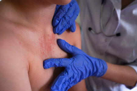 Doctor in rubber gloves examining skin of patient with red rash in clinic closeup
