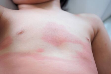 Urticaria or hives on the back, on the shoulder red rashes, itchy bumps .