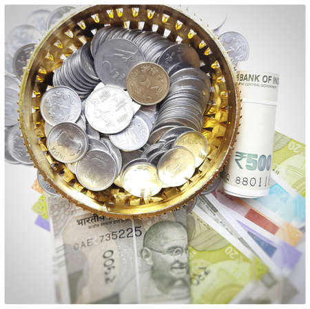 Indian Paper Money at indoor with placing coins at indoor
