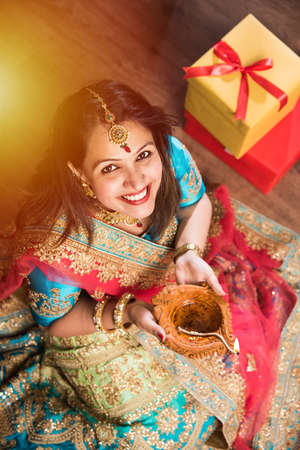 beautiful indian girl holding diya on diwali festival night, top view.selective focus