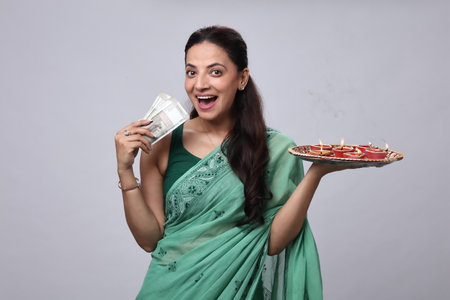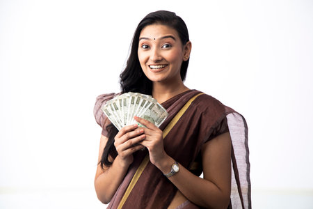 indian woman holding money and smiling at the camera on white background