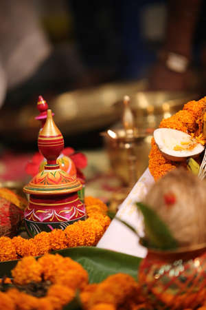Kathmandu Nepal August 27, 2018 Closeup of various objects for a religious ceremony inside the Pashupatinath temple in the morning