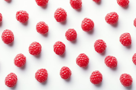 Bright red raspberries are scattered uniformly across a clean white surface, highlighting their plump shape and vibrant color, ideal for desserts, salads, and refreshing drinks.