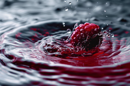 A juicy raspberry breaking the water's surface, sending ripples and droplets flying in all directions.