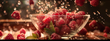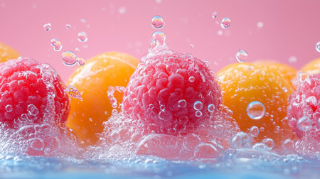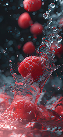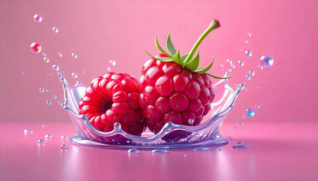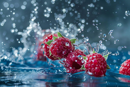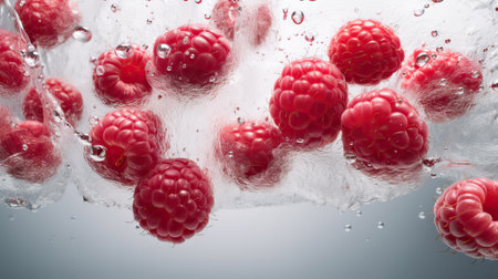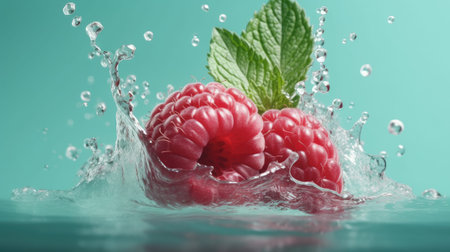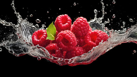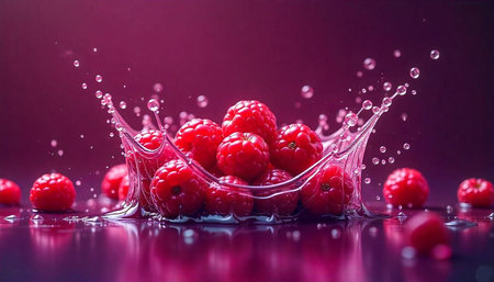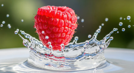Vibrant raspberries create a stunning and beautiful splash in the crystalclear water surrounding them