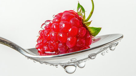 A vibrant red raspberry resting on a shiny spoon, adorned with glistening water droplets, showcasing the beauty and freshness of nature's delightful fruit.
