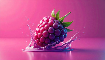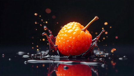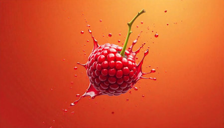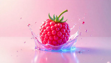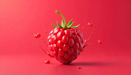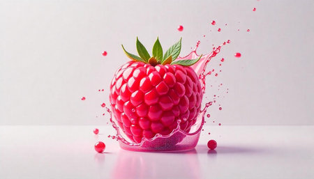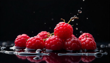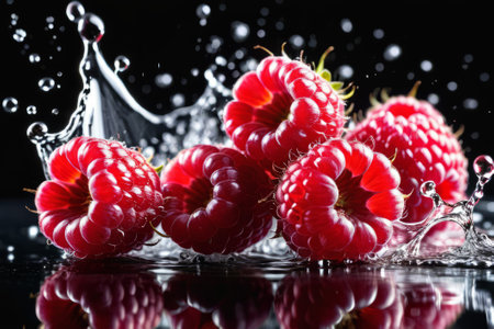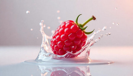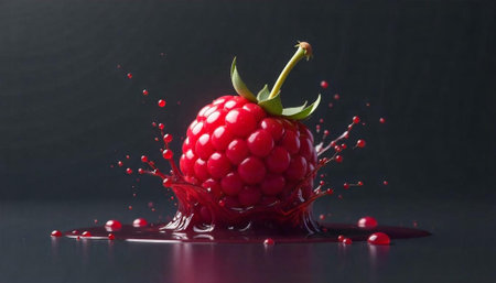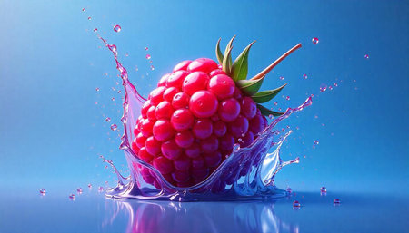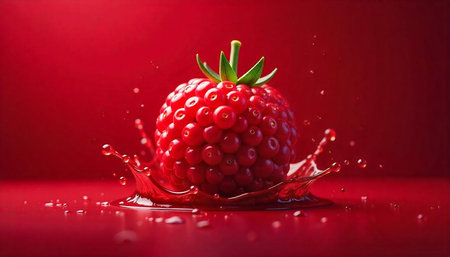Vibrant raspberry with juice splash on reflective surface
