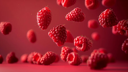 Ripe raspberries seem to float against a rich red backdrop, capturing a moment of pure freshness and vibrant color. Perfect for those who love the beauty of nature. Generated AI