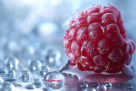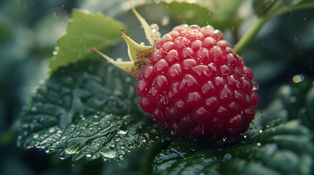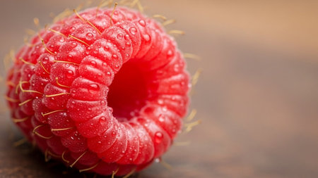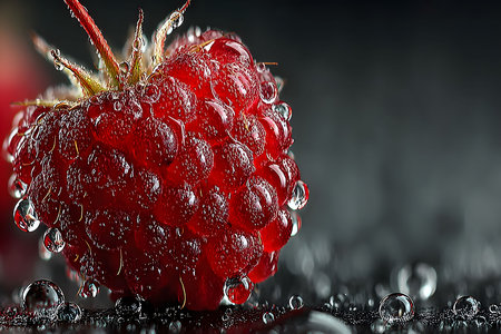 Close up of fresh raspberries with water droplets. The vibrant red color and juicy texture make it a delicious and healthy snack