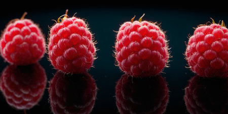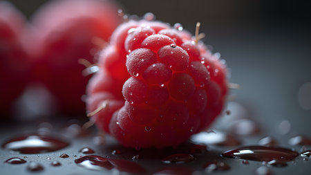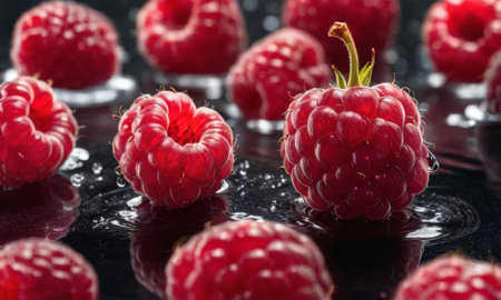 Ripe red raspberries on a black glossy surface with scattered water drops, emphasizing their freshness and juicy texture AI generation