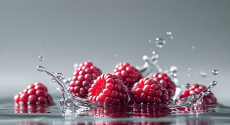 Fresh raspberries creating splashing water droplets