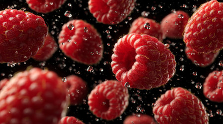 A dynamic scene capturing fresh raspberries falling through the air with droplets of water, set against a striking black background, emphasizing freshness and vibrancy.