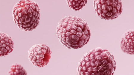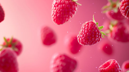Explore the beauty of fresh raspberries floating against a soft pink backdrop, perfect for highlighting nutrition, cuisine, and healthy lifestyle themes in your projects.