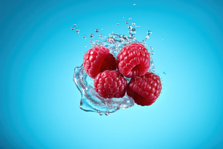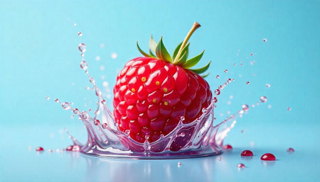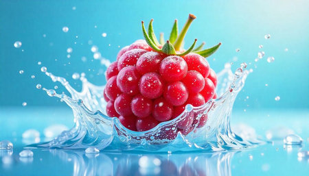 Juicy raspberry splashing into clear, refreshing water in studio