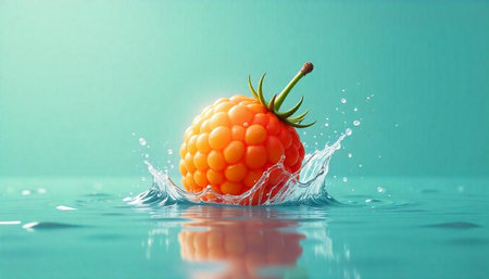 Vibrant orange raspberry splashing into fresh water concept image