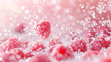 A stunning close-up of fresh raspberries splashing in water, creating bubbles on a soft pink background, perfect for food and beverage themes.