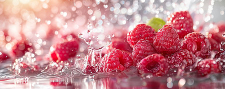 Fresh raspberries splashed in water with vibrant backdrop. Banner with ripe red raspberry