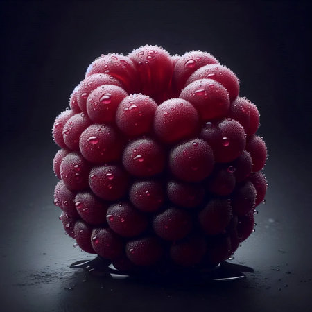 A detailed close-up of a fresh raspberry adorned with glistening water droplets. the vibrant red berry contrasts beautifully with the dark, blurred background, its texture and natural freshness. Generative AI