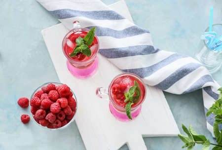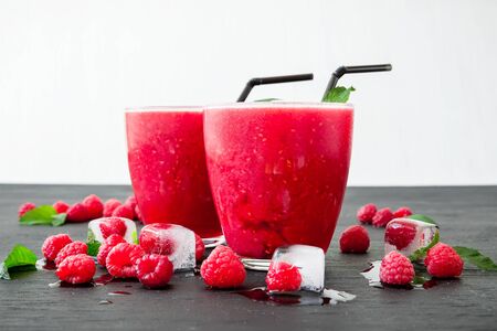 Drink from ripe red raspberries in two transparent glasses, summer background. Summer seasonal freshly refreshing drink
