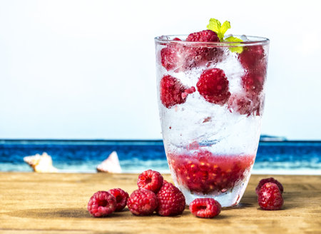 Refreshing summer cocktail with raspberries and mint on wooden table
